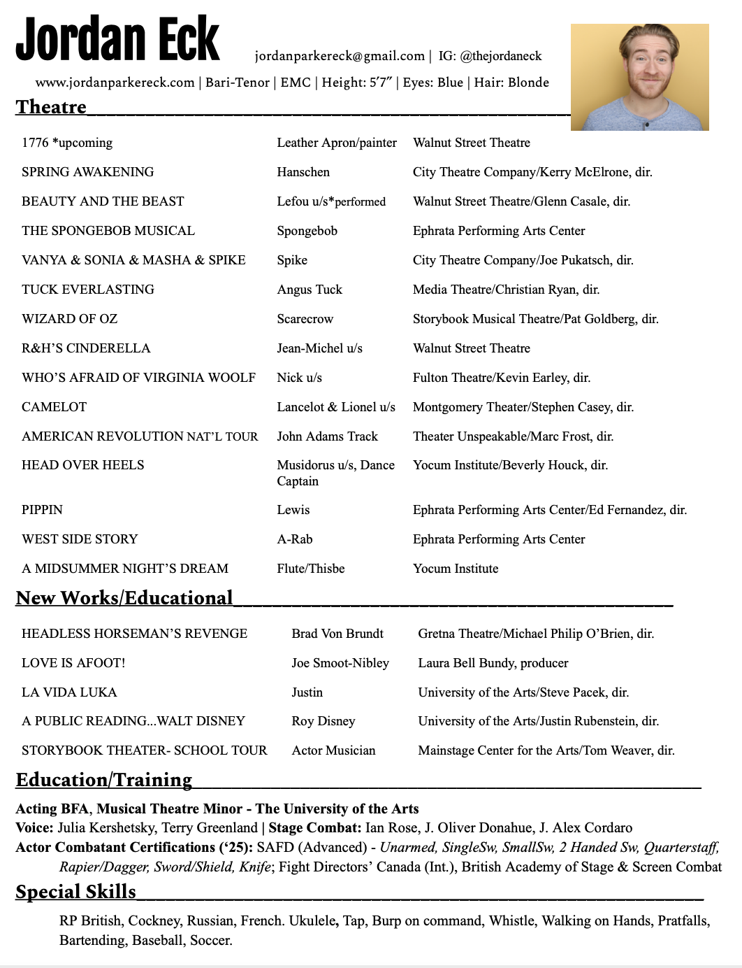 Download Headshot and ResumeResume & Headshot PDF:https://www.jordanparkereck.com/s/Eck_Jordan_ResumeHeadshot-Website.pdf Headshot PDFs:Beard: https://www.jordanparkereck.com/s/EckJordanHeadshotPDF.pdf Shaven: https://www.jordanparkereck.com/s/EckJordanHS.pdf